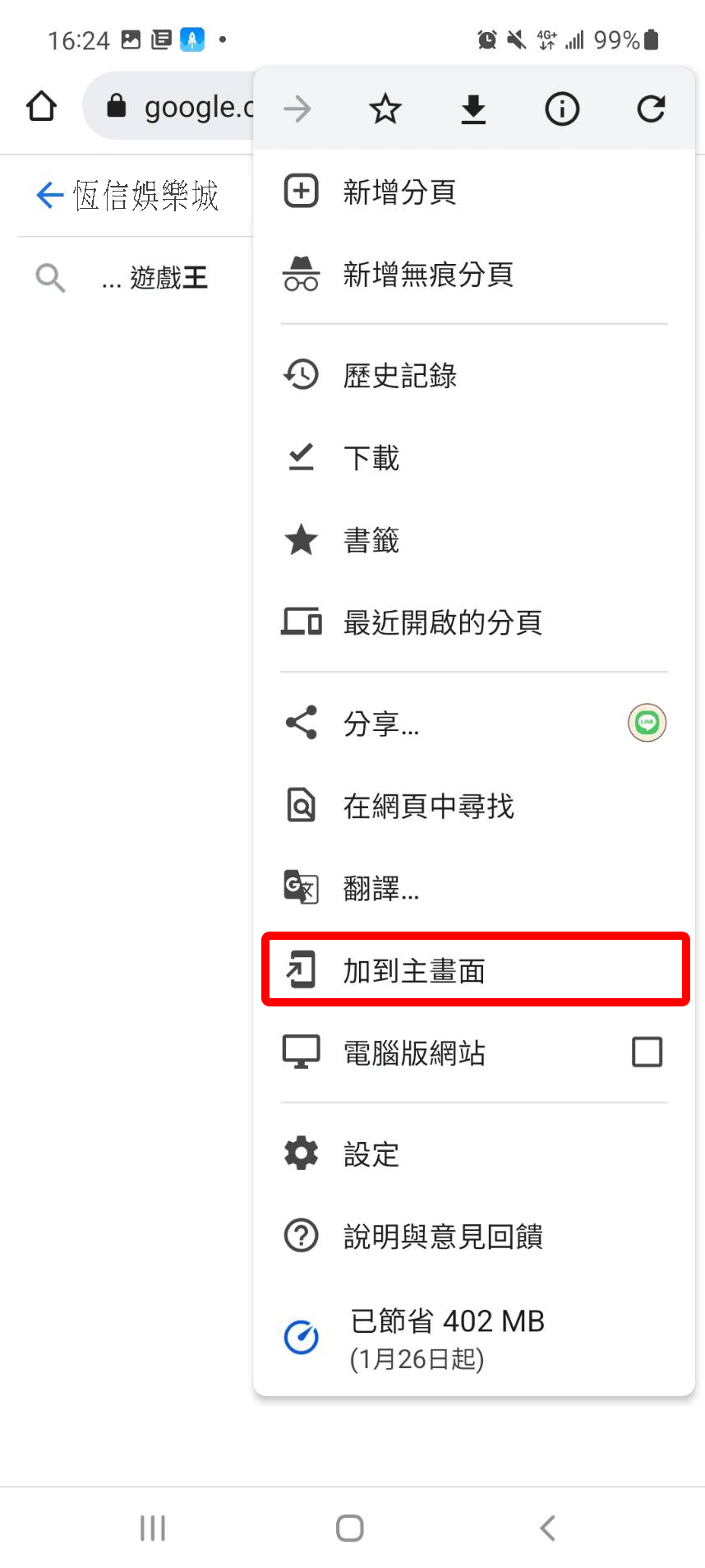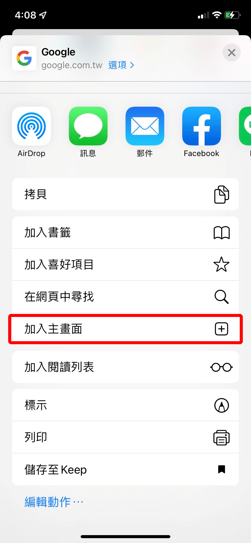 按一下「加入主畫面」